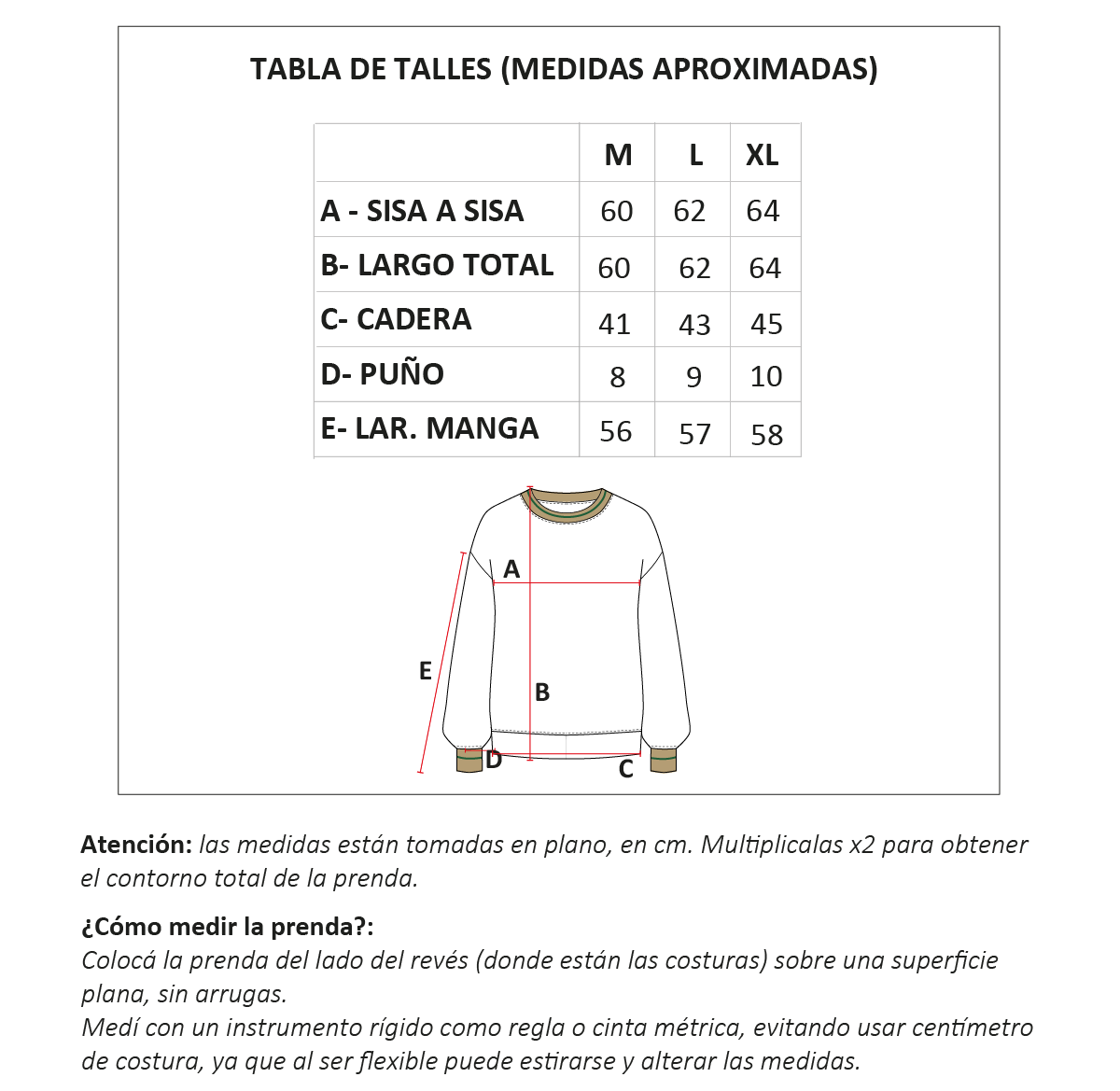 Cuidados de la prenda: Para conservar el buzo en perfectas condiciones, se recomienda lavar a mano o en lavarropas con agua fría (máx. 30°) utilizando un programa suave. Lavar del revés para proteger la estampa y el brillo del cuello. No usar lavandina ni productos abrasivos. Evitar retorcer la prenda, no secar al sol y no planchar, especialmente sobre la estampa o el cuello.