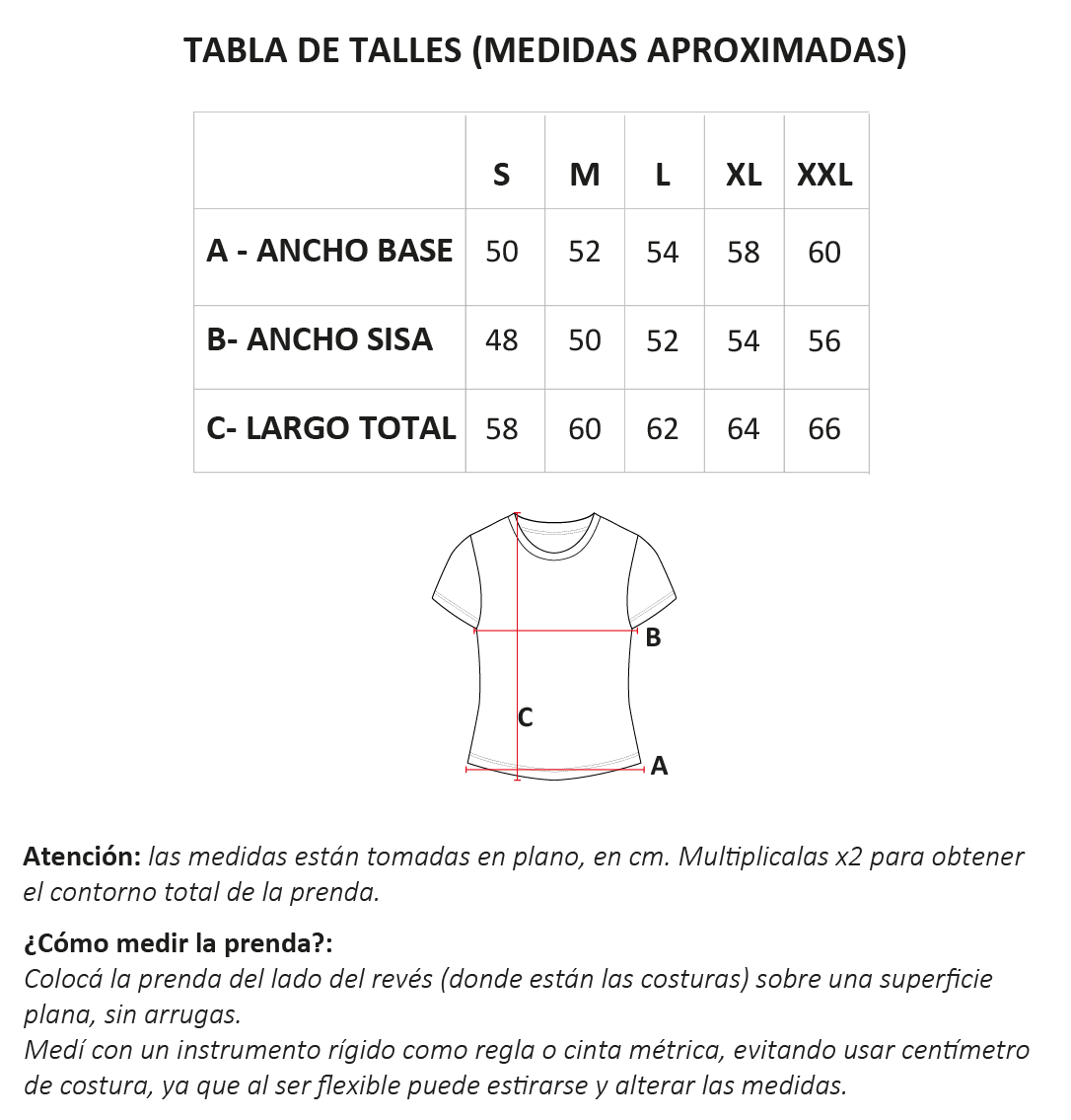 Modo de lavado: No usar lavandina. Lavar a mano o en programa corto con agua fría (máx. 30°C). No secar al sol. No planchar directamente sobre la estampa.